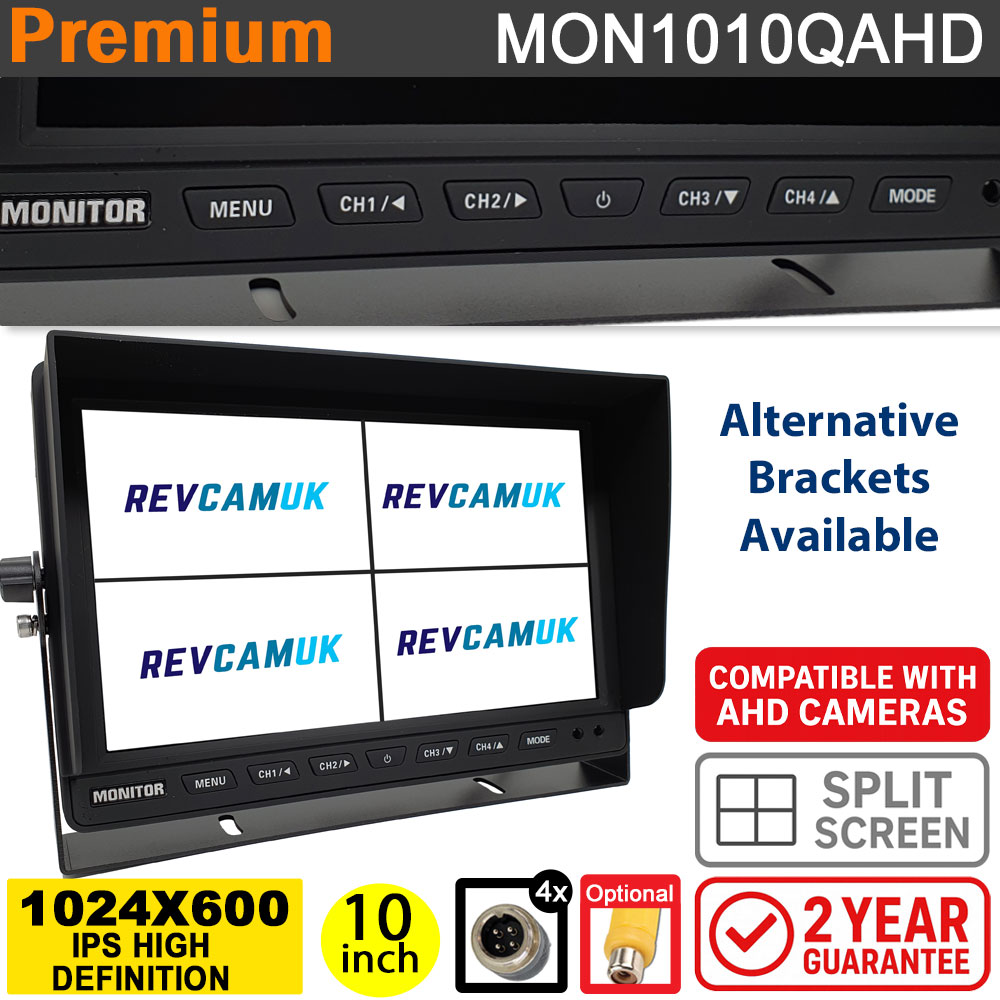 10 Inch Quad Input Monitor for 720P/960P/1080P AHD reversing / side / rear view cameras 4 Channel Split Screen Monitor that can accept up to 4 vehicle side view, rear view, and reversing cameras. Full-screen or split in one of various arrangements on screen. Advanced menu system to make alterations to settings. Full screen, 50/50 split, three-way, quad pattern split screen display. Can accept CVBS, 720P/960P/1080P AHD signal cameras. Heavy-Duty U Bracket. Instructions included, see download section of listing. - Extra Large Display - The 10 inch IPS panel display used on this monitor is a big screen. This size is suitable for larger vehicles with plenty of dash space for mounting.