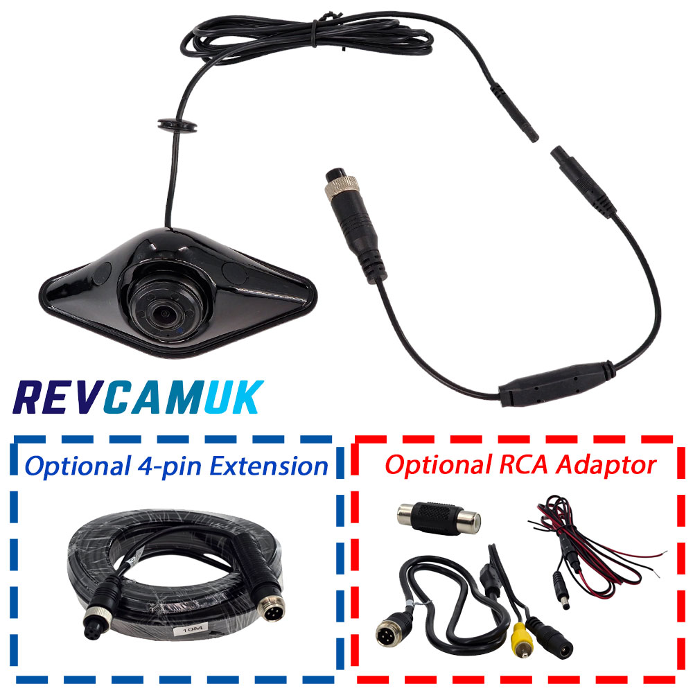 Black diamond style reversing camera with 4-pin connector, optional 4-pin extension cable and optional RCA adaptor set from REVCAMUK.