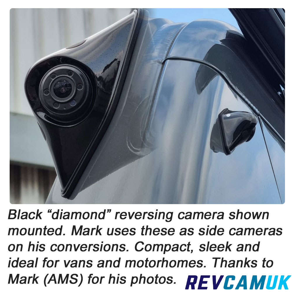 Black diamond reversing camera mounted on the side of a van conversion, used as a side-view camera. Photo courtesy of Mark from AMS.