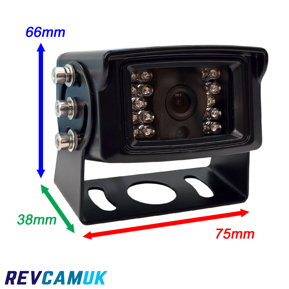 Dimensions of CAM637 black Sony CCD reversing camera showing 75 mm width, 66 mm height and 38 mm depth, black mounting bracket, suitable for cars, vans, motorhomes, trucks and HGVs.