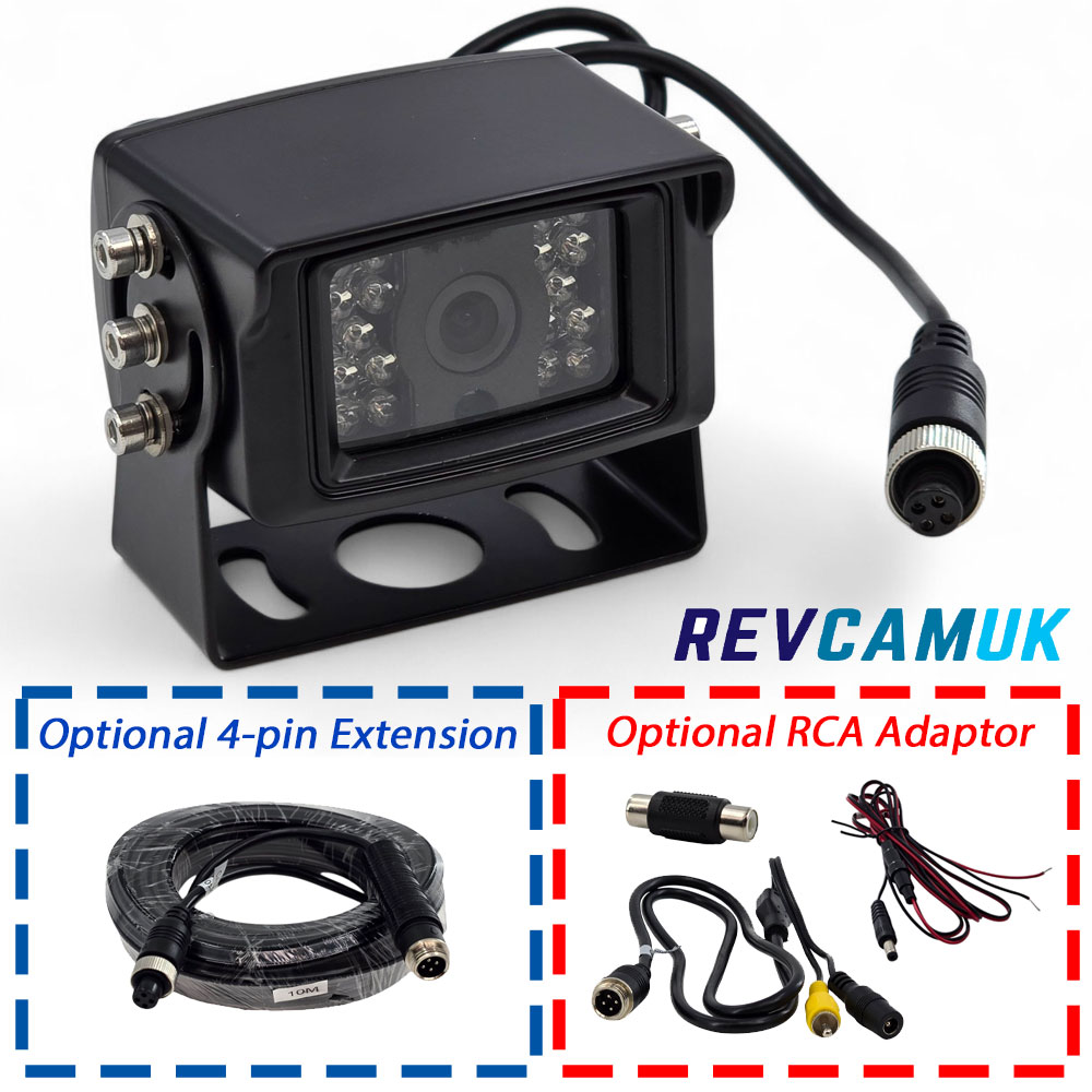 Black Sony CCD reversing camera with black mounting bracket and 4-pin connector, optional RCA adaptor shown, suitable for cars, vans, motorhomes, trucks and HGVs.