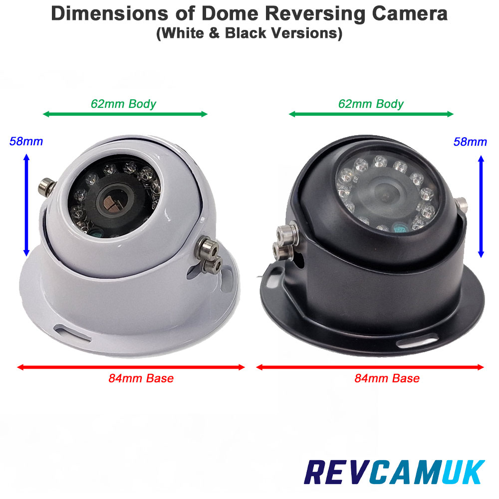 Dimensions of white and black dome reversing camera showing 58mm height, 62mm body width and 84mm base diameter
