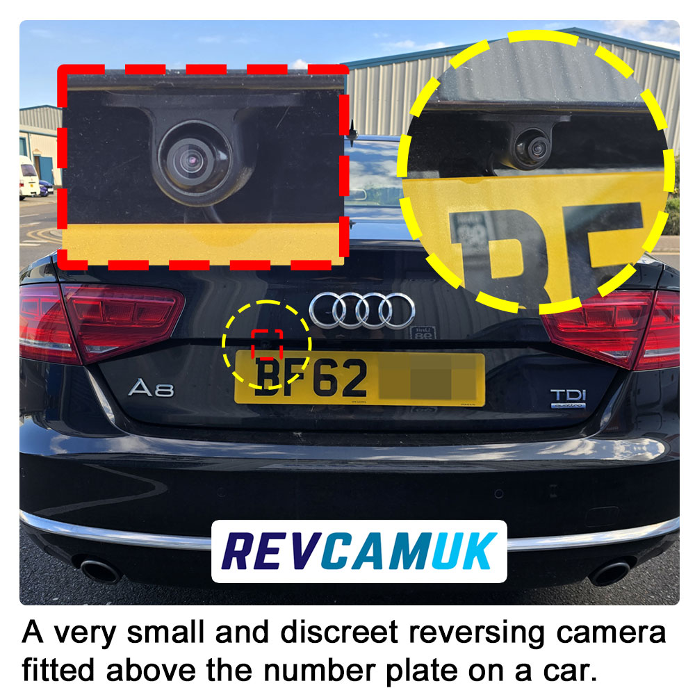 CAM502 ultra-small and discreet reversing camera fitted above a rear number plate, showing a subtle installation that blends neatly into the vehicle trim while providing a clear rear-view image.