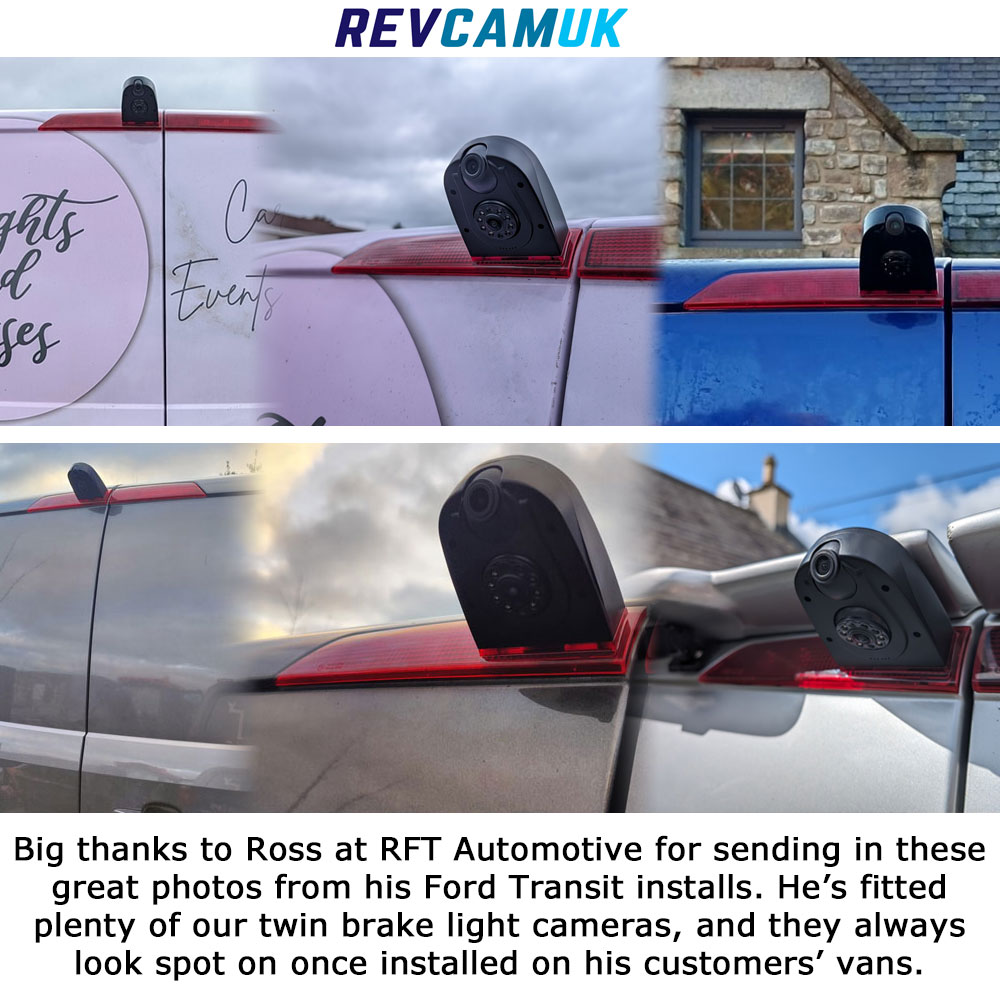Dual lens brake light reversing and rear view camera fitted to a Ford Transit Custom van, installed by Ross from RFT Automotive in Ellon, Aberdeenshire, featuring a neat factory-fit finish