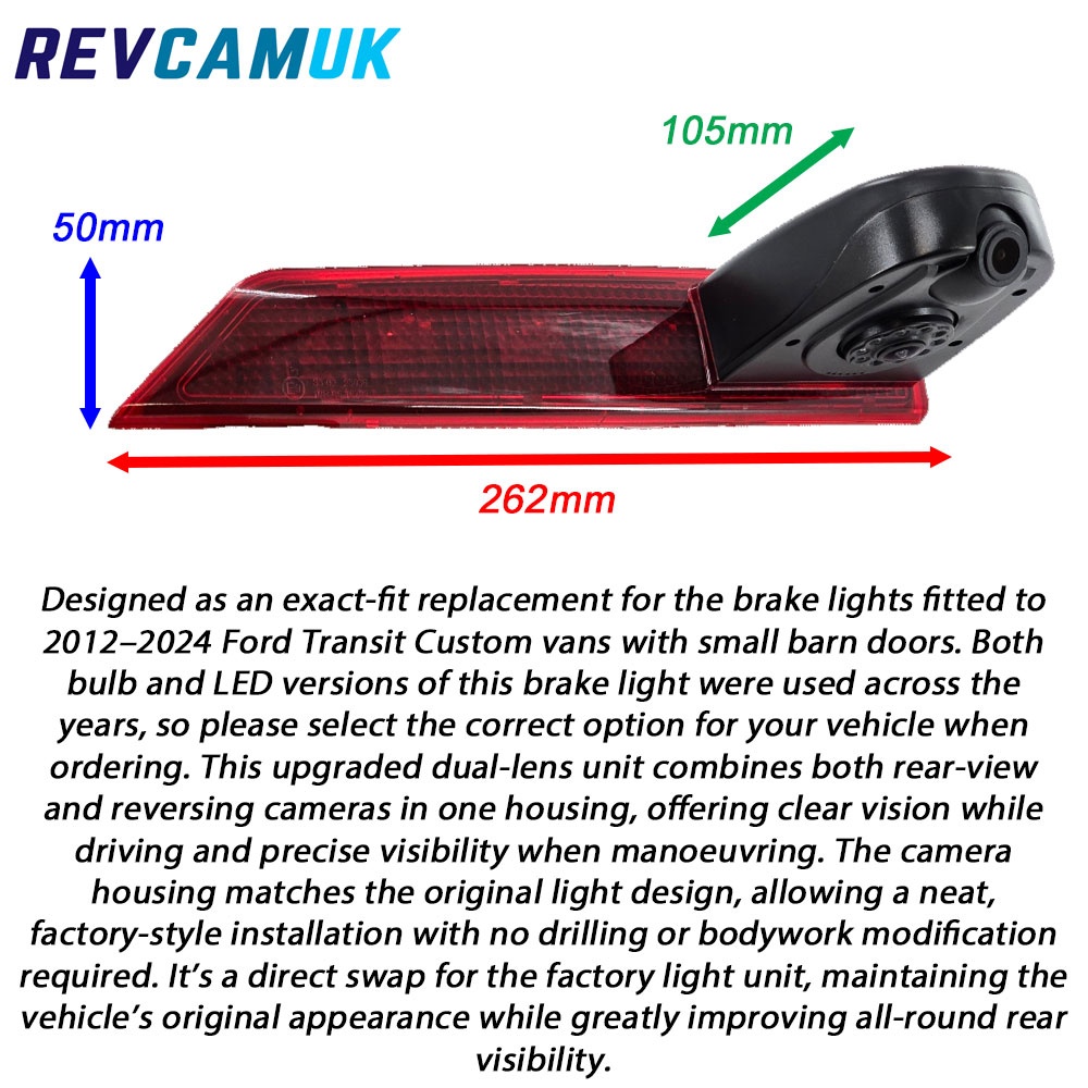 Dual lens brake light reversing and rear view camera dimensions for 2012–2024 Ford Transit Custom small barn door vans – 262mm width, 105mm height, 50mm depth – REVCAMUK.