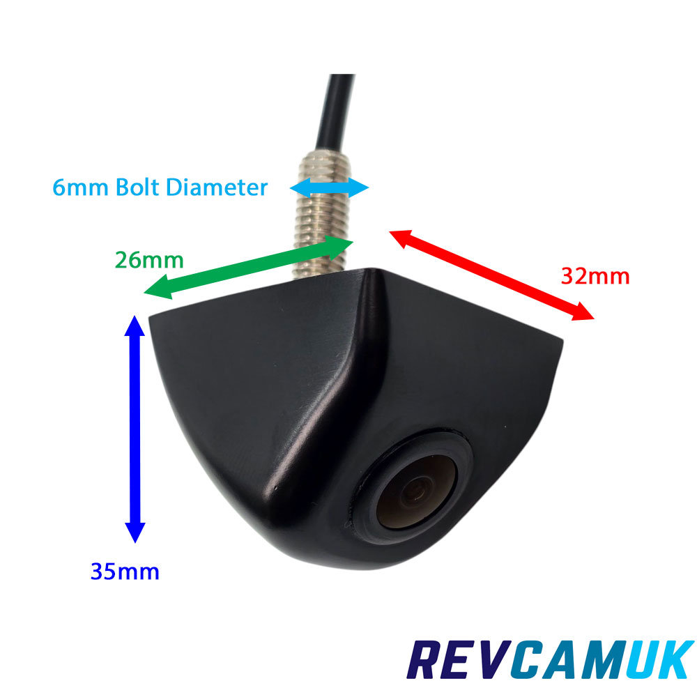CAM072B black bolt-on reversing camera dimensions image showing 6 mm bolt diameter, 35 mm height, 32 mm width and 26 mm depth, suitable for vertical or horizontal surface mounting.