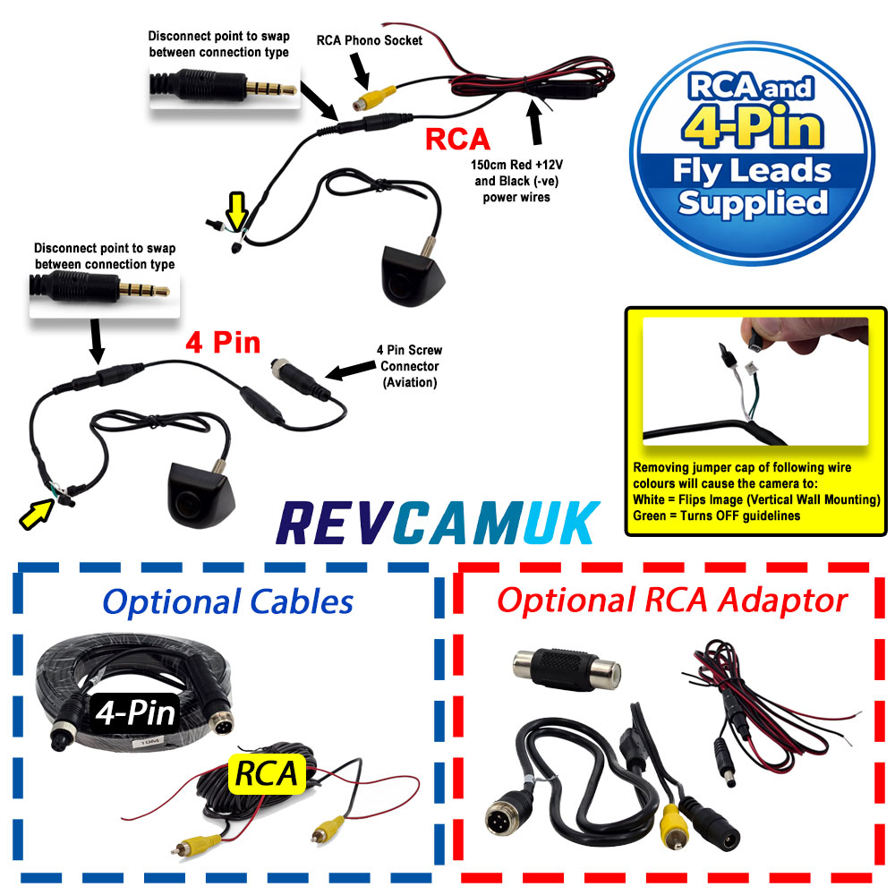 About the Black Van Motorhome Bolt Reversing Camera - CAM072BBlack Motorhome reversing camera, fitted with a vertical flip so you can mount the camera up high on a vertical wall or low down on the numberplate light trim. Comes with both 4 Pin Connector AND RCA connector wiring. High-resolution image Sensor with a wide field of view. The cable entry is via the bolt that fixes it to the bodywork. Simply drill a hole for the bolt, attach the supplied split nut and tighten to secure. Guideline function can be turned ON or OFF. Adhesive camera base gasket supplied. Small Black Discreet Reverse Camera - This camera is very small and discreet, which makes it hard to spot when installed against a dark vehicle such as a Van or Motorhome. Great Image Quality - The camera has a high-quality PC1058 Image Sensor fitted, which returns a 700tvl high-resolution image. Check out our photos of the camera outputting its image to a Monitor (sold separately). Wide Viewing Angle - With a 150 degree lens fitted, this camera gives you a lovely wide field of view to help avoid obstacles around the rear of your vehicle. 6G Lens - Fitted with 6x Glass Layers, 1 with a coated film filter that only allows 380–650nm visible light to pass (the same spectrum as the human eye). This reduces interference from other wavelengths such as UV and IR light and helps prevent damaging UV rays from affecting the image sensor. The result is excellent colour replication and a clear image. Vertical Flip Function allows mounting to Rear Wall OR above Number Plate - We had this camera produced with a function loop that connects into a jumper on the camera main board to tell it whether you plan to mount the camera against a rear wall, or hanging underneath the number plate light trim. For fitting to the rear wall simply unplug the jumper cap on the white wire loop (see our images). If you are currently watching the camera whilst removing the caps the change won't take effect until the camera has been power cycled. Static Guideline Function ON/OFF - As standard the guidelines are turned ON. To remove them unplug the jumper cap on the green wire loop (see images). If you are currently watching the camera whilst removing the caps the change won't take effect until the camera has been power cycled. 4 Pin + RCA Connector Wiring Supplied - This camera has a small connector to help get through the small hole drilled for the bolt that the wire comes through. This then connects into one of two wiring looms. The first is a 4 pin screw aviation type. The second is an RCA Phono connector type. Increased Reversing Safety - With almost a quarter of vehicle accidents in the UK occurring when reversing, this brilliant little camera will help to reduce blindspots and help to avoid incidents. Autosleeper Compatible - It can be used to replace the similar-looking OEM Autosleeper reversing camera. We have had the 3.5mm 4-Pole plug wired up the same way so that it can be simply inserted into the original socket. Some customers have reported the original camera being fixed with mastic; careful removal may be required. The connector’s plastic moulding may need light filing to ensure full insertion. 2-Year Guarantee and UK-Based Support - This reversing camera is backed by our full 2-year guarantee for added peace of mind. Should you ever need help, advice, or support, you are dealing directly with a UK-based specialist who understands the products inside out and is on hand to help both during installation and long after purchase. Connector details and power information Connectors Info (RCA and 4 Pin) The camera is supplied with both a 4-pin screw connector and an RCA phono connector. You can choose which to use by changing at the small disconnect point located roughly 60 cm back from the camera. Please note there is also a non-waterproof power regulator at the same distance. This must be positioned in a dry, protected location (for example inside a tailgate) to prevent premature failure. 4-Pin to RCA Adaptor Option Even though this camera is supplied with both connector types as standard, we still offer a discounted 4-pin to RCA adaptor for those who need it. This can be useful in two scenarios: 1) Modern vehicles with CANBUS or pulsed (PWM) reverse feeds Using a 4-pin cable plus this adaptor lets you take camera power from an ignition feed at the front of the vehicle instead of relying on the reverse light feed. You can still connect a simple reverse-light trigger so the monitor or stereo only wakes up when reverse is selected. 2) Viewing the camera even when not in reverse If you want to see the camera on demand (for example while driving forward or towing), the adaptor allows you to power the camera independently and view it without needing to be in reverse gear. What’s in the box