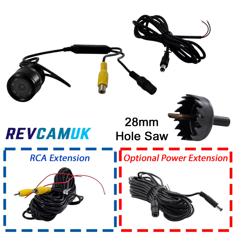 CAM039 bumper bullet flush fitting reversing camera with RCA connection, supplied with 28mm hole saw, RCA extension and optional power extension lead