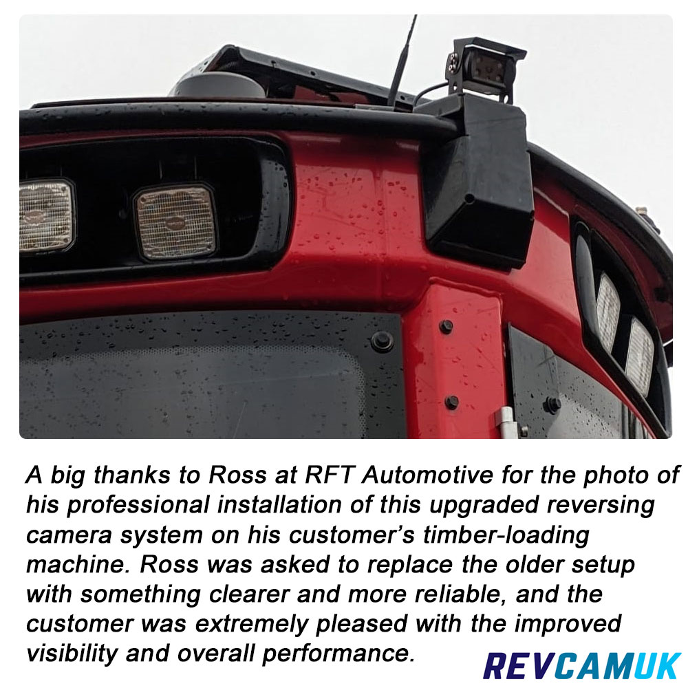 Installed CAM022AHD reversing camera on a timber-loading machine, thanking Ross from RFT Automotive
