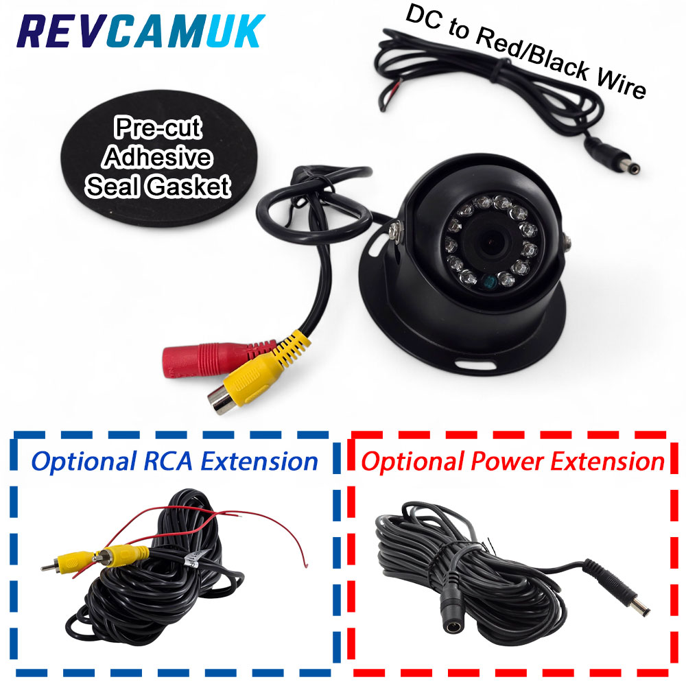 CAM069B black dome reversing camera contents image showing Sony CCD camera with adhesive seal gasket, DC power lead, RCA connection and optional RCA and power extension cables for vans and motorhomes
