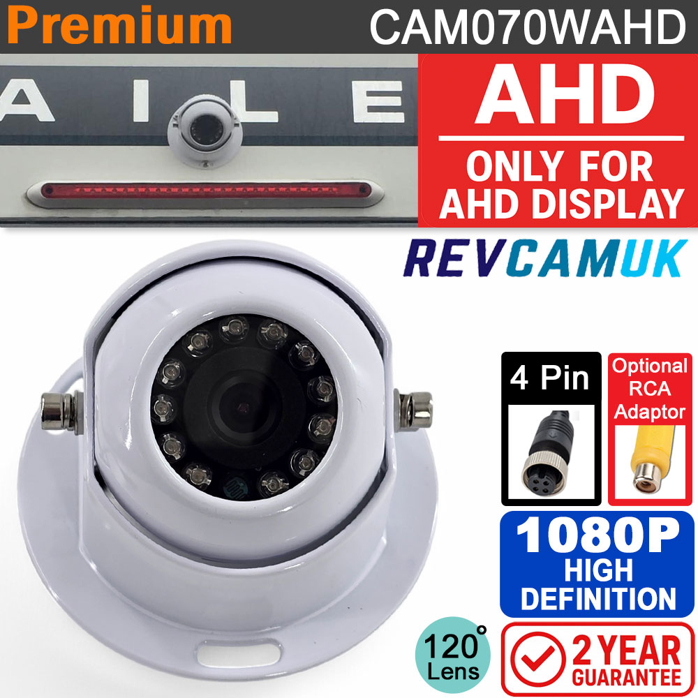CAM070W AHD – White Dome-Style 1080P AHD Reversing CameraThis is the CAM070WAHD, the high-definition version of our white dome reversing camera. It uses the Sony IMX307 1080P AHD image sensor, giving a sharp, detailed picture with excellent colour reproduction and strong low-light performance. The dome housing keeps the camera unobtrusive and blends neatly with lighter vehicle bodywork. Infrared LEDs activate when light levels drop, helping to provide a decent night-time image. The camera is popular with motorhomes, caravans, vans and commercial vehicles. A black version (CAM070B AHD) is also available. It comes with our two-year guarantee and reflects the trusted reliability of Reversing Cameras UK. Key FeaturesHigh-Definition Sony IMX307 AHD Image Sensor - The IMX307 1080P chip produces a crisp and well-balanced picture with excellent colour accuracy and strong performance in both day and night conditions. Discrete Dome Housing - The subtle dome shape provides a smart, factory-style appearance that many customers prefer over more visible bracket cameras. Night Vision with Infrared LEDs - The built-in IR LEDs help illuminate the area behind the vehicle during darker conditions, without distracting other road users. IP68 Weather Resistant - Designed to withstand rain and harsh British weather when installed using the included sealing pad. Mirror Image Output - Provides the correct mirror-reversed view for reversing, matching the behaviour of a traditional rear-view mirror. Wide Viewing Angle - Offers a broad field of view to help reduce reversing blind spots. Improved Reversing Safety - A clear rear image reduces the risk of accidental damage when reversing. 4-Pin Waterproof Screw Connector - Uses the durable and widely adopted 4-pin aviation connector for maximum reliability. AHD compatibility notice Please note: This is a high-definition 1080P AHD camera. It must be used with a monitor that supports AHD video input. Standard-definition CVBS screens will not display an image from this camera. If you need an AHD-capable screen, please see our AHD monitor category. Extension cable optionsWe offer extension cables from 1M to 20M, with selected lengths available with a slim 8 mm disconnect joint positioned approximately 1M from the monitor end. This compact joint helps when feeding the cable through tight areas such as grommets, headlining and vehicle trunking. RCA adaptor set optionThe optional RCA adaptor set includes all parts needed to connect this camera to RCA-based screens. It contains a CAB0020 4-pin to RCA adaptor, a CAB101 1.5M power lead with inline 3A fuse, and a small RCA coupler for linking into RCA inputs where required. What’s in the box