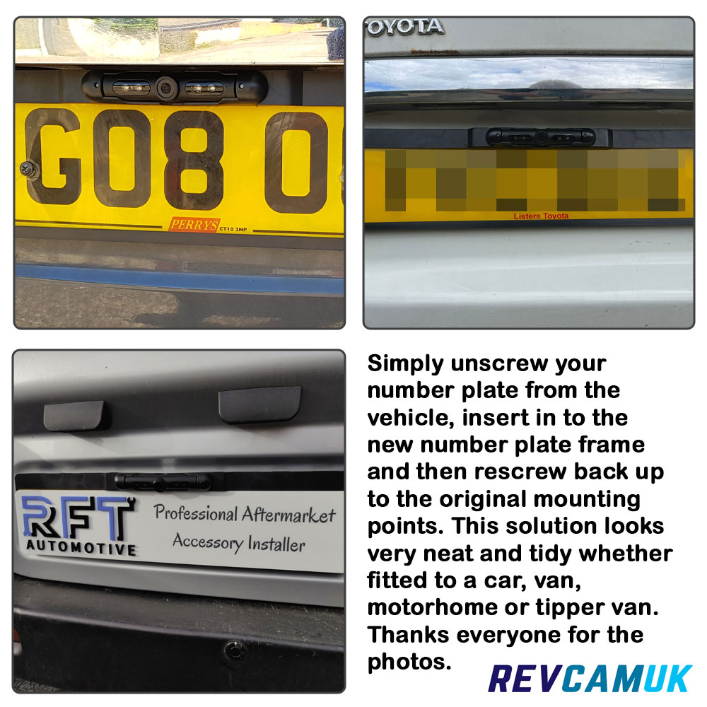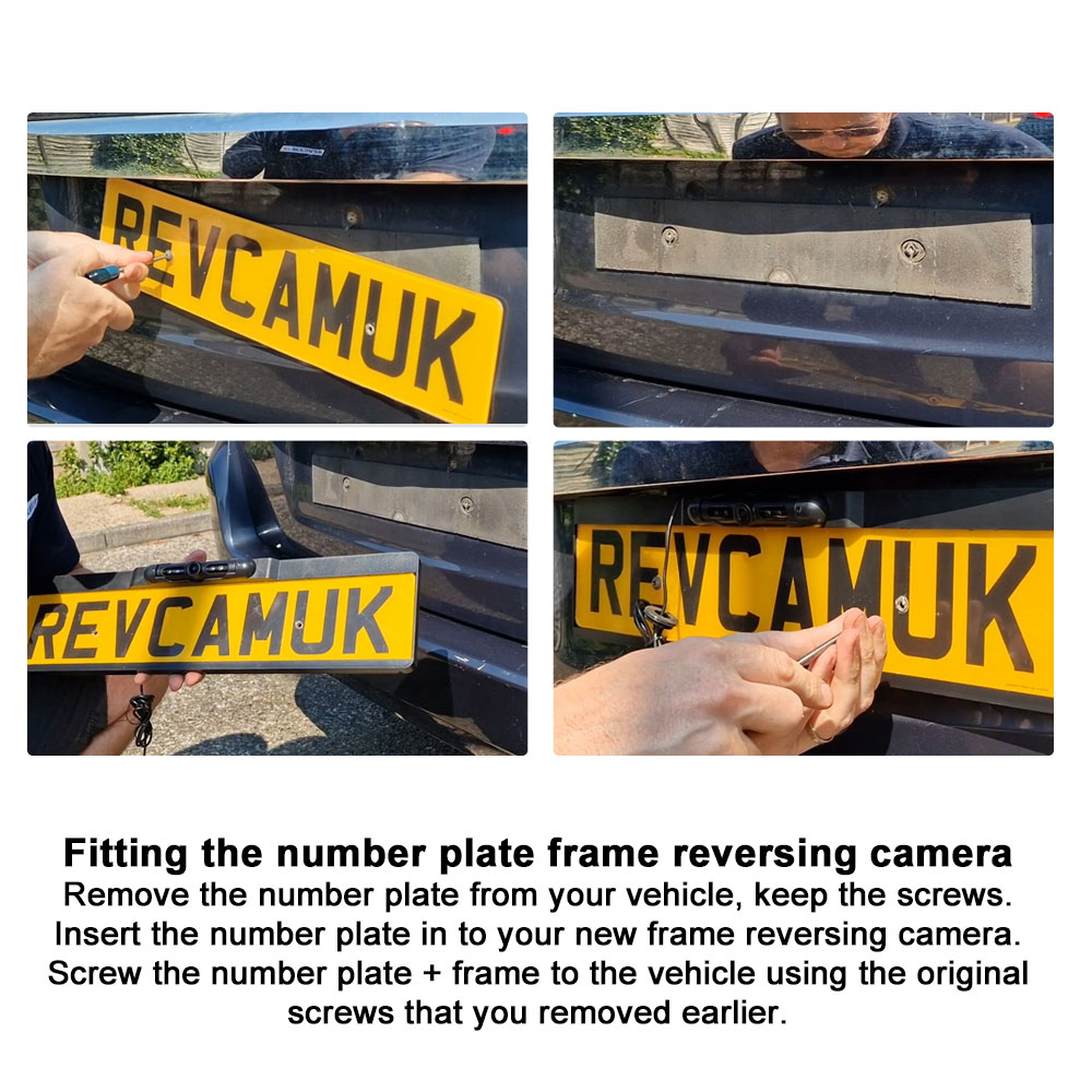 How to fit the number plate frame reverse camera to your vehicleThis camera is very easy to install. 1. Unscrew your existing number plate from your vehicle 2. Slide the number plate in to the new number plate frame camera 3. Fix the number plate + frame camera to the vehicle using the original screws 4. Make a small channel on the number plate light to allow the wire to enter the vehicle without getting crushed (or use the attached grommet). See our video below to see the installation of the number plate reversing camera. For best viewing, ensure the playback quality is set to HD. Download our fitting guide for the number plate frame camera |