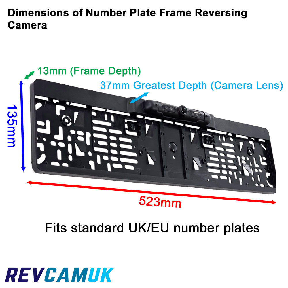 Dimensions of the number plate frame reversing camera showing 523 mm width, 135 mm height, 13 mm frame depth and 37 mm maximum depth at the camera lens. Fits standard UK and EU number plates – REVCAMUK.