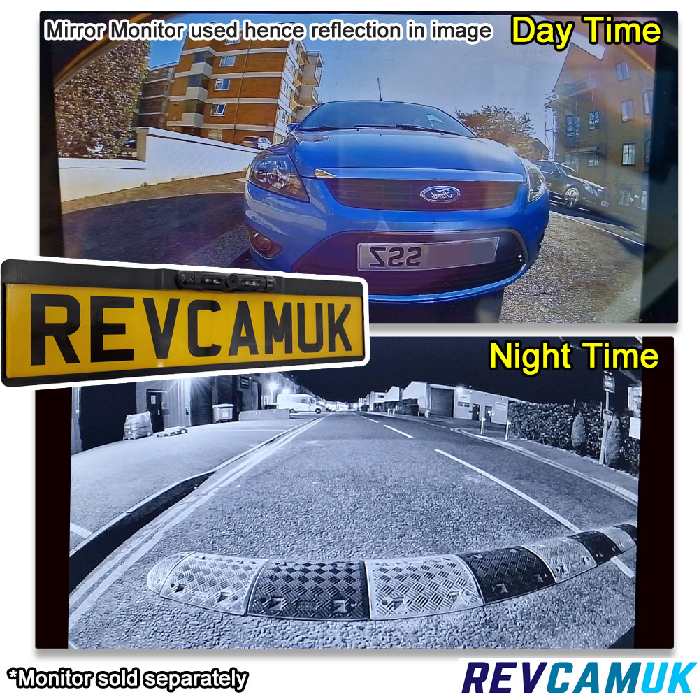 Day and night camera performance demonstration of the CAM104AHD number-plate frame reversing camera using a mirror monitor