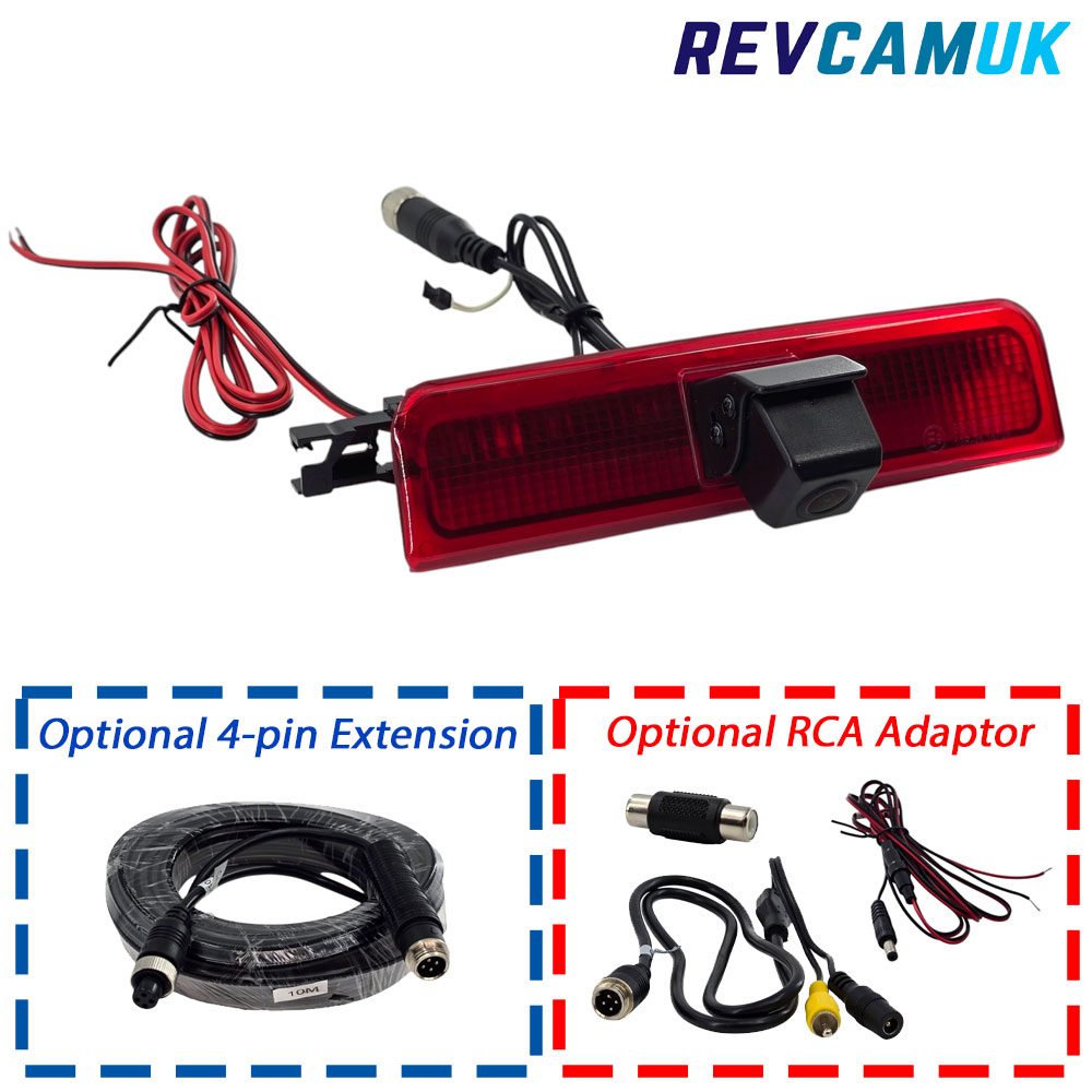 Brake light reversing camera for Volkswagen Caddy (2004–2020), showing the camera unit with power lead, optional 4-pin extension cable, and optional RCA adaptor options – REVCAMUK.