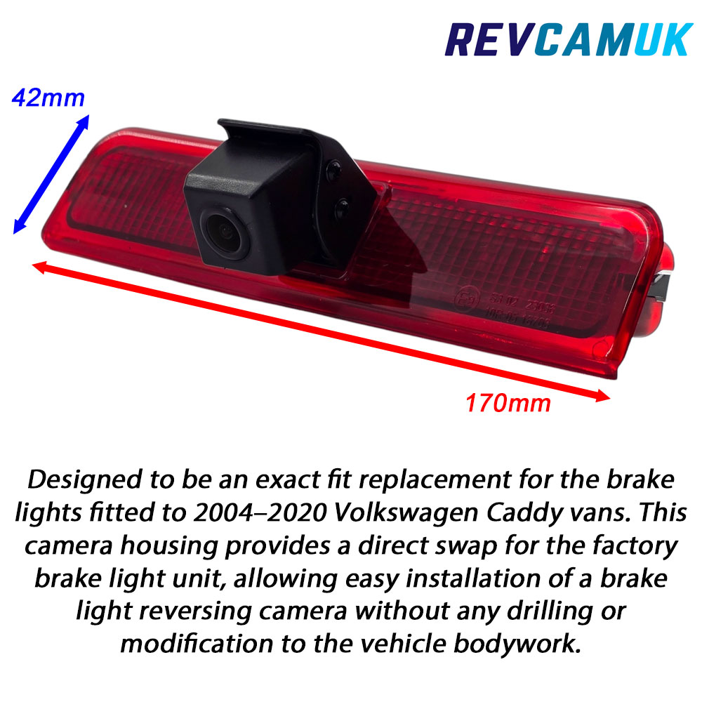 Brake light reversing camera for Volkswagen Caddy (2004–2020) with dimensions shown, providing a direct replacement for the factory brake light housing – REVCAMUK.