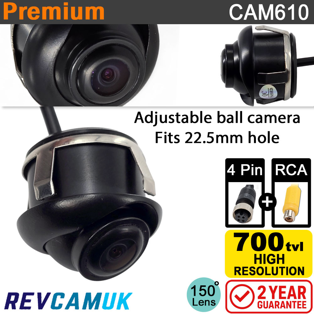 Adjustable Flush Fit Ball/Bullet Reversing Camera - CAM610Black mini adjustable ball reversing camera, fitted with a vertical flip function so you can mount the camera up high on a vertical rear wall or low down on the number plate light trim. Supplied with both a 4 Pin connector and RCA connector wiring. High-resolution image sensor with a wide field of view. Simply drill a hole with the supplied 22.5mm holesaw and push the camera into place until the spring clips lock. Guideline function can be turned ON or OFF. Small Black Discreet Reverse Camera - This camera is very small and discreet, which makes it hard to spot once installed. Great Image Quality - The camera has a high-quality PC1058 image sensor fitted, which produces a 700TVL high-resolution image. Check out our photos of the camera outputting its image to a monitor (sold separately). Wide Viewing Angle - With a 150 degree lens fitted, this camera gives you a lovely wide field of view to help avoid obstacles around the rear of your vehicle. 6G Lens - Fitted with 6x glass layers, including one coated film filter that only allows 380-650nm visible light to pass (the same spectrum as the human eye). This reduces interference from other wavelengths such as UV and IR light, and helps prevent damaging UV rays from affecting the image sensor. This all means that you get great colour replication and a clear image. Vertical Flip Function allows mounting to Rear Wall OR above Number Plate - We had this camera produced with a function loop that connects into a jumper on the main camera board to tell it whether you plan to mount the camera against a rear wall, or hanging underneath the number plate light trim. For fitting to the rear wall simply unplug the jumper cap on the white wire loop (see our images). If you are currently watching the camera whilst removing the cap, the change won’t take effect until the system has been power cycled (turned off and back on). Static Guideline Function ON/OFF - As standard the guidelines are turned ON. To remove them, unplug the jumper cap on the green wire loop (see images). If you are currently watching the camera whilst removing the cap, the change won’t take effect until the system has been power cycled (turned off and back on). 4 Pin + RCA Connector Wiring Supplied - This camera has a small connector to help get through the hole drilled for the bolt that the wire passes through. This then connects into one of two wiring looms. The first is a 4 pin screw aviation type. The second is an RCA phono connector type. Increased Reversing Safety - A significant proportion of vehicle accidents in the UK occur when reversing, and this compact camera will help to reduce blind spots and help to avoid incidents. |