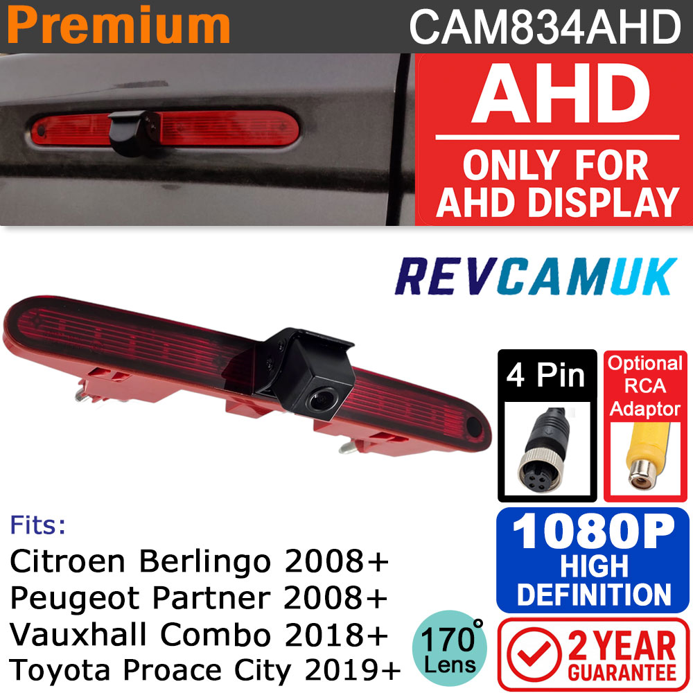 Citroen Berlingo / Peugeot Partner / Vauxhall Combo / Toyota ProAce City Brake Light Reversing Camera (1080P AHD) | CAM834AHDThe CAM834-AHD Brake Light Reversing Camera is a factory-style upgrade designed for Citroen Berlingo, Peugeot Partner, Vauxhall Combo, and Toyota ProAce City models. It replaces the original upper brake light, creating a clean OEM appearance while adding a high-definition reversing camera. Using the latest C2399 1080P AHD sensor and all-glass lens, it delivers sharp images with excellent colour balance and wide coverage, even in low light from the vehicle’s own lamps. Please note: This 1080P AHD brake-light reversing camera for Citroën Berlingo, Peugeot Partner, Vauxhall Combo and Toyota Pro Ace City is only compatible with AHD-compatible monitors and will not work with most factory or older displays. For the standard CVBS version, please see our Standard CVBS brake-light reversing camera for Citroën Berlingo, Peugeot Partner, Vauxhall Combo & Toyota Pro Ace City. Key features