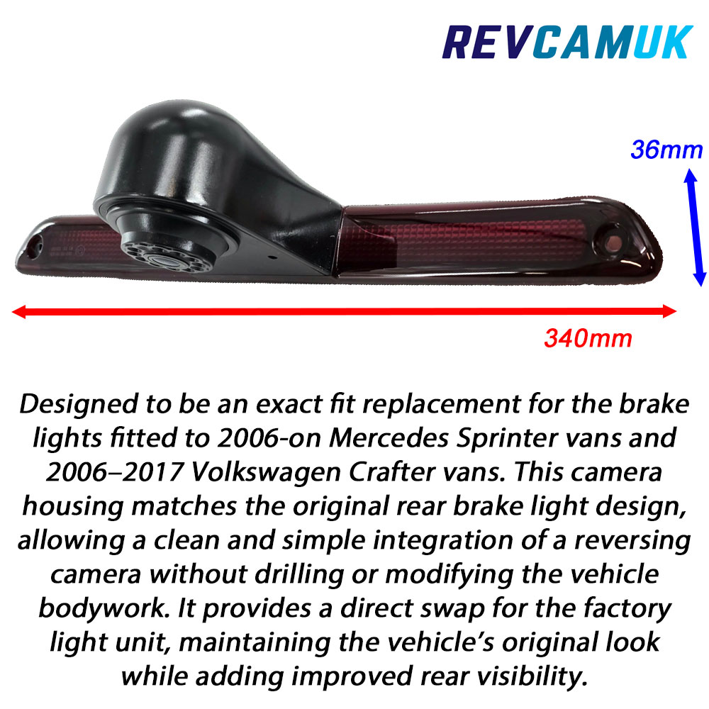 Mercedes Sprinter / VW Crafter Brake Light Reversing Camera (1080P AHD) | CAM906-AHDThe CAM906-AHD Brake Light Reversing Camera provides a factory-style upgrade for Mercedes Sprinter (2006-Present) and VW Crafter vans (2006–2017). It replaces the original upper brake light with a purpose-built housing that integrates a 1080P AHD camera using a C2399 PAL image sensor and all-glass lens for clear, detailed images when reversing. Please note: This 1080P AHD brake-light reversing camera for Mercedes Sprinter and VW Crafter is only compatible with AHD-compatible monitors and will not work with most factory or older displays. For the standard CVBS version, please see our Standard CVBS brake-light reversing camera for Mercedes Sprinter and VW Crafter. You’ll find links to complete kits further down this page. Key features