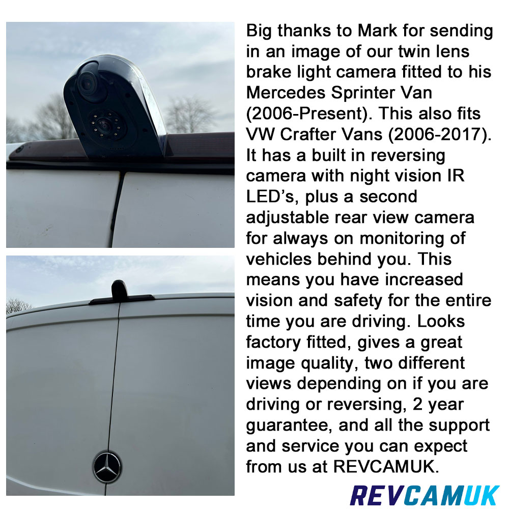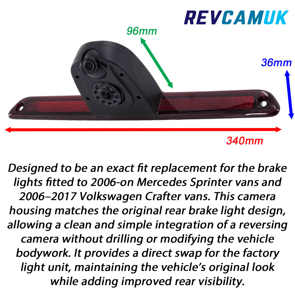 Mercedes Sprinter / VW Crafter Dual-View Brake Light Reversing & Rear-View Camera (1080P AHD) | CAM906TW-AHDThe CAM906TW-AHD Dual-View Brake Light Camera is designed to replace the original upper brake light on Mercedes Sprinter (2006–Present) and VW Crafter (2006–2017), while adding two independent 1080P AHD cameras inside one factory-style housing. It gives you a dedicated wide-angle reversing view plus a separate rear-view driving lens, making it useful throughout the entire journey and not just when parking. The downward lens provides a bright, wide reversing image for manoeuvring, lining up to a tow hitch or approaching a loading bay. The second lens is angled outward to act more like an interior mirror replacement, giving a more natural perspective of traffic behind you while driving. Together, both lenses significantly improve rear visibility on long vans and coachbuilt conversions where a standard interior mirror is unusable. Please note: This 1080P AHD twin-lens brake-light camera is only compatible with AHD-capable monitors. It will not work with older CVBS-only factory screens. For the standard CVBS version, please see our Standard CVBS Twin Brake Light Camera for Mercedes Sprinter & VW Crafter. Key featuresDual-lens brake light camera – Two separate cameras inside one OEM-style brake-light housing. One lens looks downwards for reversing, while the second looks straight out the back for a clear driving view. Ideal for long wheelbase vans, camper conversions, delivery vans and minibuses where a traditional mirror view simply isn’t possible. Dedicated reversing lens – The downward-facing AHD lens gives a wide, detailed reversing view, making parking much easier. It’s perfect for tight spaces, campsite pitches, warehouse loading bays or hitching up a trailer. Infrared LEDs help maintain a clear image in low-light situations. Dedicated rear-view driving lens – The second lens uses a narrower angle with no infrared LEDs to provide a more natural daytime rear-view perspective. This makes following traffic appear more lifelike and avoids the “everything looks far away” effect found on wide-angle cameras. Ideal for continuous rear-view use while driving. True 1080P AHD image quality – Both lenses use high-quality C2399 CMOS PAL sensors for a sharp HD picture. Detail, clarity and colour reproduction are noticeably stronger than standard-definition CVBS cameras, especially when viewed on a 7-inch AHD monitor. All-glass lenses – Fitted with proper glass optics rather than plastic, giving better long-term sharpness, improved accuracy of colour and reduced UV fading over time. Designed for durability on commercial vehicles. OEM-style replacement unit – Replaces the original upper brake light without the need to drill metal panels. Maintains the factory appearance of the vehicle while adding significantly improved rear visibility and overall safety. Weatherproof IP68 housing – Built to cope with the worst weather the UK can throw at it. The sealed brake-light housing prevents water ingress and is suitable for vehicles permanently stored outdoors. Supplied with 10 m 7-pin cable & adaptor – Comes with a 10-metre 7-pin main camera cable and a 7-pin → dual 4-pin adaptor. This lets you connect both lenses to compatible 4-pin monitors, split-screen systems or DVRs. Optional adaptors and cables – Add 4-pin → RCA adaptors if you’re connecting to an RCA-based aftermarket display. Extra 10–15 m extension cables available for long wheelbase and extra-long wheelbase installations. UK tested with 2-year warranty – Fully tested and supported in the UK for reliability and peace of mind. Vehicle fitment Compatible with the following vehicle models: