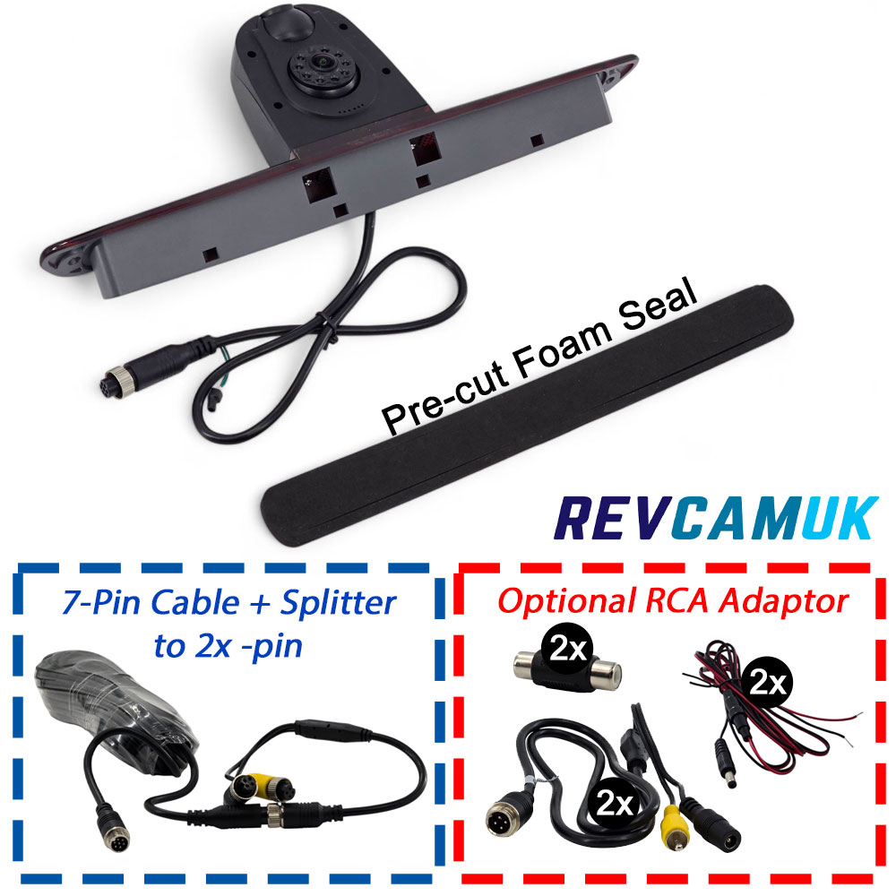Dual-lens reversing and rear-view brake light camera for Mercedes Sprinter (2006–present) and Volkswagen Crafter (2006–2017), showing the camera unit, pre-cut foam seal, 7-pin cable with splitter to 2× 4-pin, and optional RCA adaptor options – REVCAMUK.