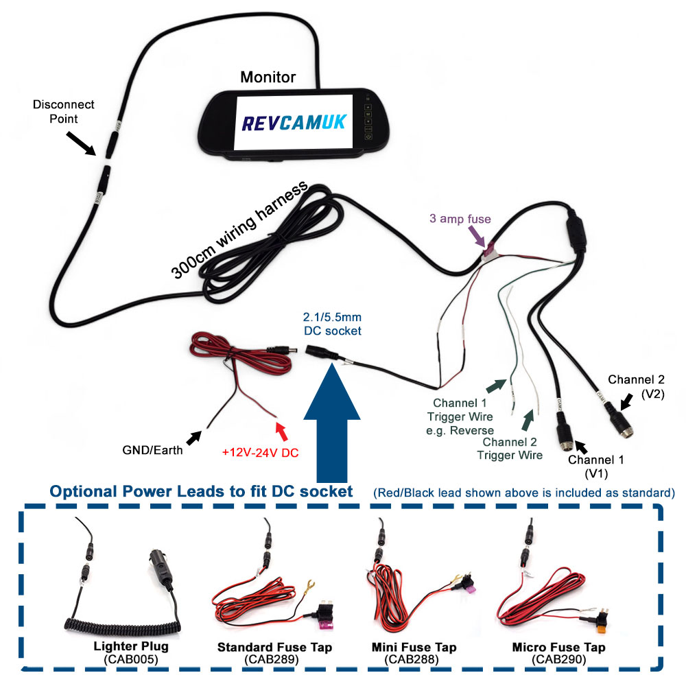 Wiring layout of RevcamUK MON293AHD clip-over mirror monitor showing power input, video inputs, trigger wire and all cable connections