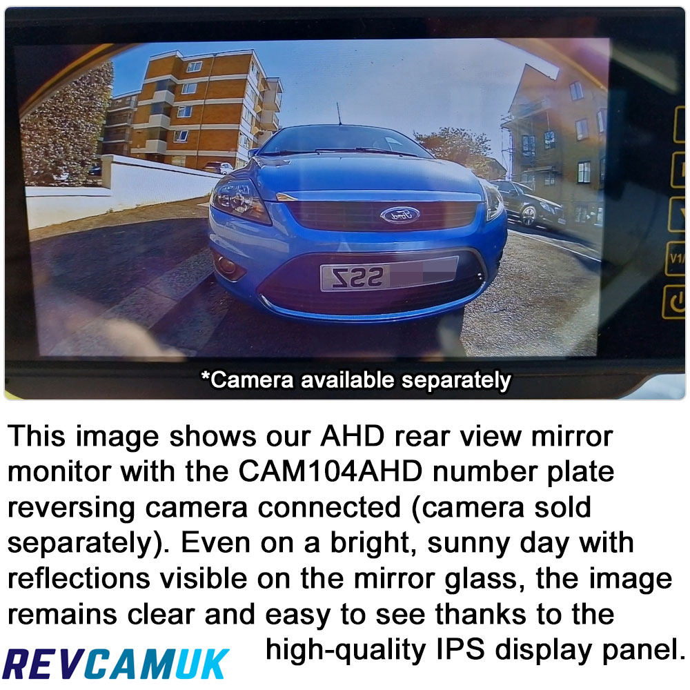AHD rear view mirror monitor showing CAM104AHD number plate reversing camera image in bright daylight, camera sold separately
