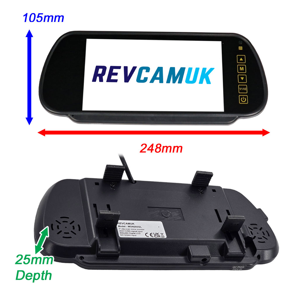 7-inch Mirror Monitor Display for AHD High Definition Reversing / Rear View Camera - MON293AHDOur popular high-definition mirror monitor has been updated for 2026 and is designed to clip over your existing interior mirror, whether on a motorhome, van, or car. It is secured using strong spring-loaded clamps with rubber grips to ensure a stable fit. High Quality IPS 7" Panel for Great Image Quality - This monitor is made by our most respected monitor manufacturer, it keeps on getting better. This latest model has a very capable 7" IPS panel fitted. IPS is the technology used in gaming monitors for the great viewing angles and colour replication. This means the image is easy to see, even in bright cabins. Clip-over Original Interior Mirror - On the back of the monitor, there are two spring-loaded clamps with rubber gripper feet, one at the top and one at the bottom. This clamps the monitor firmly against the OEM mirror in your vehicle. If you don't have a mirror in your vehicle, please check out our bracket-direct-to-windscreen AHD mirror monitor. Works on both 12V & 24V Vehicles - Whether you are fitting to a 12V vehicle such as a motorhome, van, or car, or installing it in a larger commercial vehicle such as an HGV or LGV, this monitor is a very good option. It handles voltage spikes up to 32V, ensuring a stable, protected supply to the camera. The output to the camera(s) is 12V, as most reversing cameras are designed to operate at this voltage. Optional Adjustable Guidelines - If you would like a parking guideline grid displayed when reversing, this monitor can be set to superimpose the grid over the reversing camera image when reverse gear is selected. To enable this, enter the menu system and select the channel that has the reversing camera input, then turn the guideline setting to ON. You can adjust the guidelines to your desired position on the screen. Ensure the trigger wire for this channel is connected to the reverse light feed. The lines will display when reverse gear is engaged and disappear when you are no longer reversing, which is ideal if you use the camera for both reversing and rear-view use. Two-Year Product Guarantee - This product is covered by our well-respected REVCAMUK 2-Year Guarantee, along with lifetime support. We carefully select our range based on product performance, durability, and reliability, and we stand by the products we supply. In the unlikely event that a fault occurs within the two-year guarantee period, the unit will be repaired or replaced. Comprehensive Instructions for Fitting and Operation - We provide in-depth instructions for both fitting and use of our products; this product is no exception. You will have a printed manual in the box. You are also able to download our PDF Instruction Manual for the AHD Rear View Mirror Monitor here. Works with the latest AHD signal Reversing Cameras up to 1080P - Traditionally, reversing cameras have used CVBS as the signal type. Since the earlier 2020's, a new technology called AHD entered the market that allowed a higher definition picture to be sent, as well as increased colour data. This monitor has an AHD chip built in that allows it to work with the latest 720P/960P/1080P AHD cameras. This monitor will still work with traditional CVBS, however if you only have CVBS cameras installed, we recommend using our CVBS mirror monitor instead. If you are after a full kit with this monitor, look at our related products below, or click here for Reversing Camera Kits with Mirror Monitor Category. What’s in the box