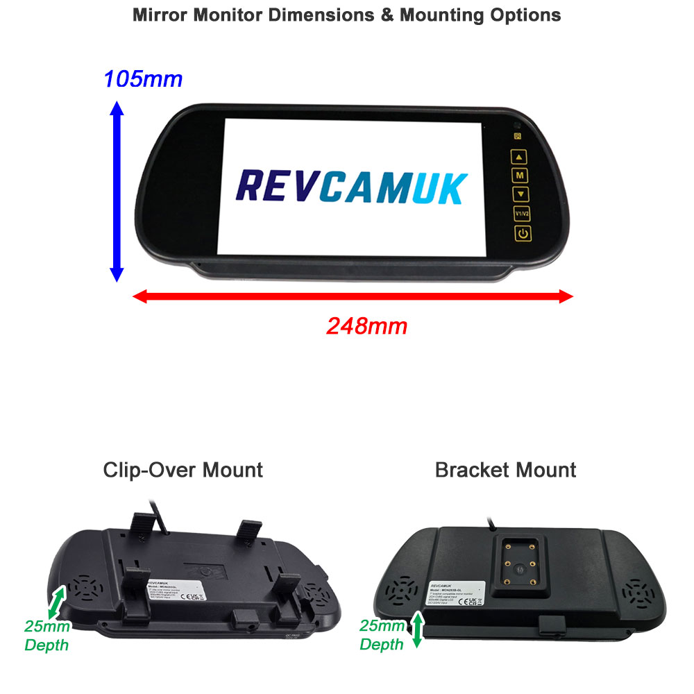 Mirror monitor dimensions with clip-over and bracket mounting options for reversing camera systems