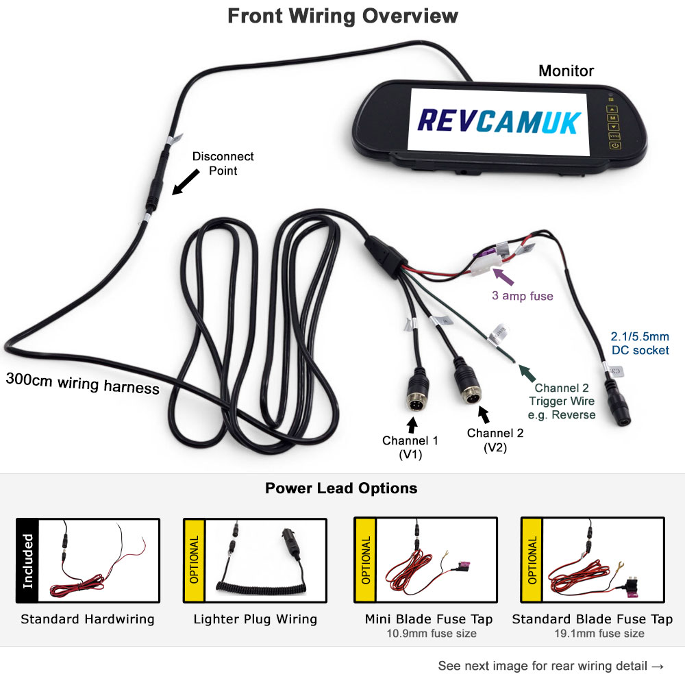 Front wiring overview for RevcamUK mirror monitor reversing camera system