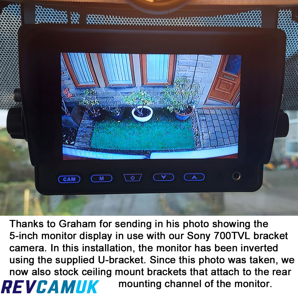 5 inch monitor display in use with Sony 700TVL bracket camera. Monitor inverted using supplied U-bracket. Ceiling mount bracket also available.