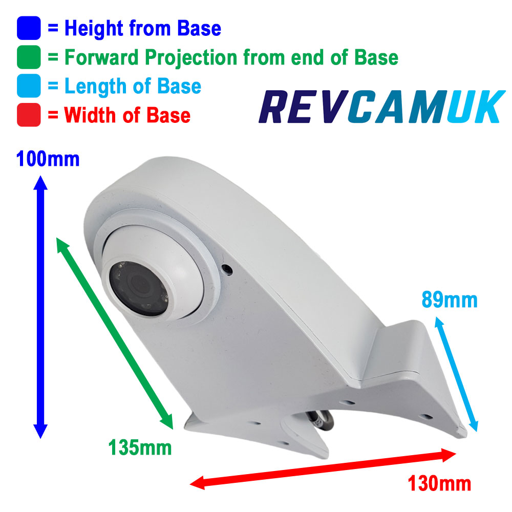 White roof-mounted reversing camera showing 100mm height from base, 135mm forward projection, 89mm base length and 130mm base width, displayed with colour-coded dimension arrows