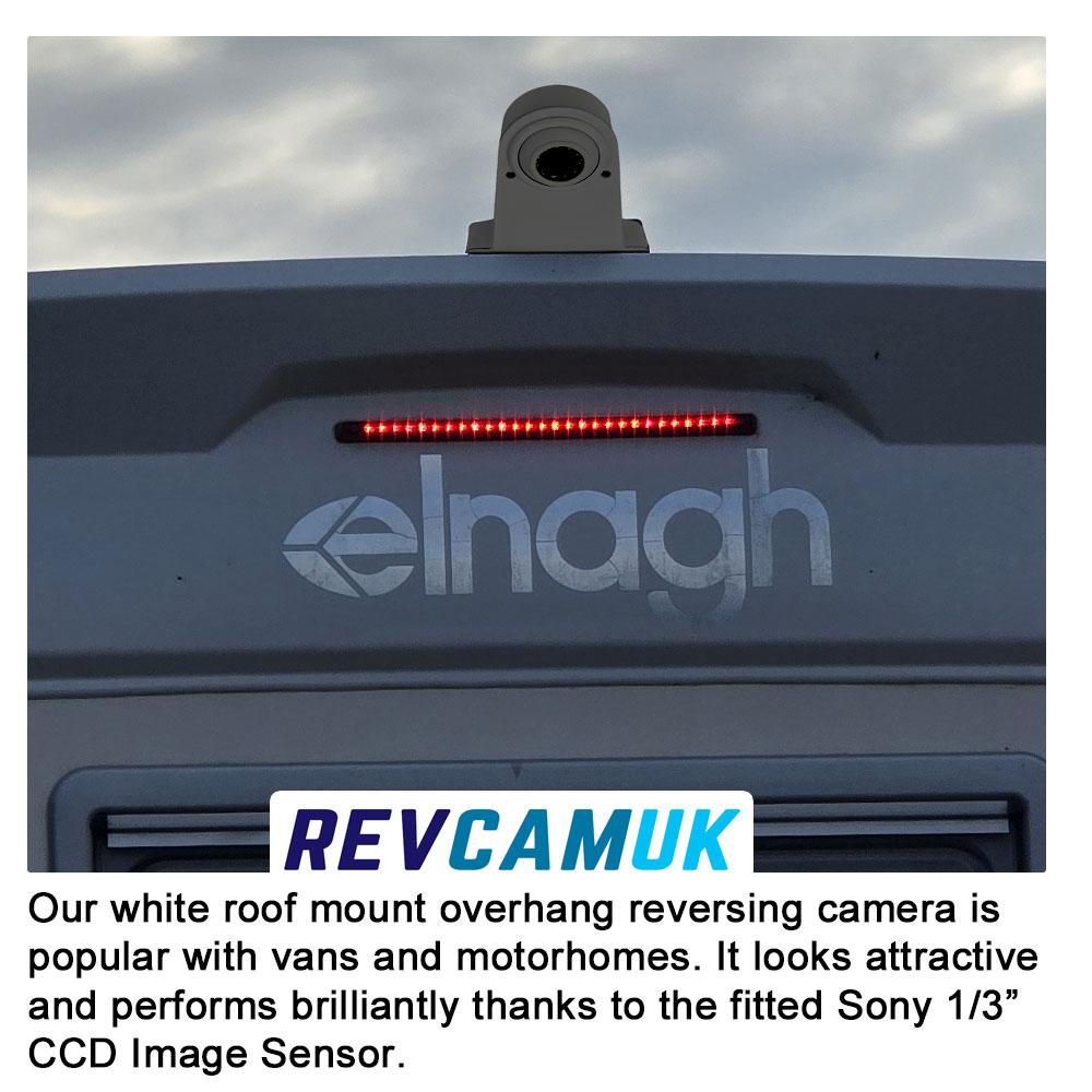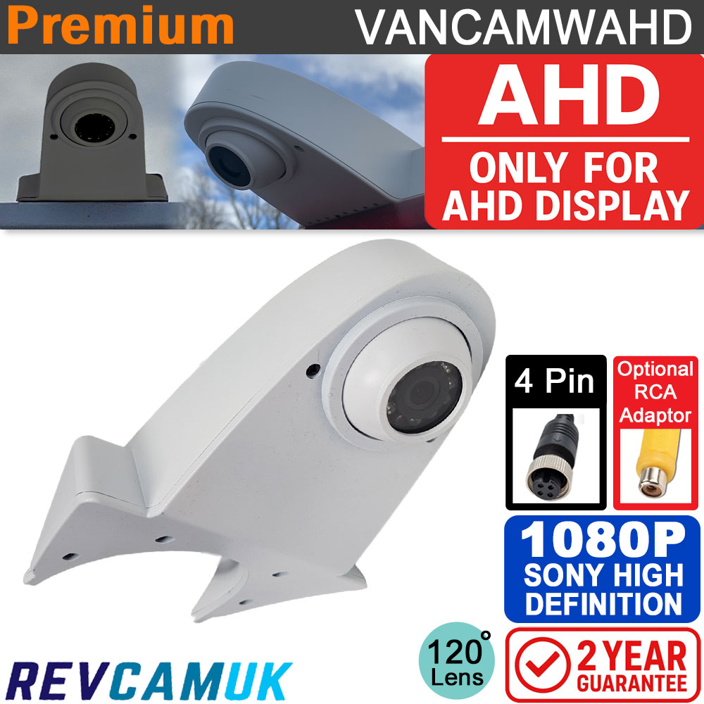 Roof-Mount 1080P Sony AHD Reversing Camera – White - VANCAMW-AHDThis is our 1080P AHD roof-mount reversing camera designed for vans and motorhomes. It attaches neatly to the rear roof lip and gives a natural-looking view downwards behind the vehicle. The camera uses the Sony IMX307 1080P AHD sensor, giving a clear, detailed picture with very good low-light performance. It includes IR LEDs for night vision, is finished in black, and uses a 4-pin aviation connector. This camera must be used with an AHD-compatible monitor and includes our two-year Reversing Cameras UK guarantee. 1080P AHD compatibility: This camera is designed for AHD 1080P PAL systems only and requires an AHD-compatible monitor or DVR. It is not suitable for most aftermarket stereos or head units and will not display on standard monitors. If you need the more universal CVBS version, please see VANCAMB CVBS black roof and overhang reversing camera compatible with standard monitors. Key FeaturesPurpose-Built Roof-Mount Design - Designed to fit on the rear roof lip of vans and motorhomes, giving a high, central view ideal for reversing into bays, judging distances and monitoring the area directly behind the vehicle. Sony IMX307 1080P AHD Sensor - The Sony IMX307 1/2.8" CMOS sensor provides a sharp 1920×1080 image with strong daytime clarity and good low-light performance. 120° Wide Viewing Angle - The 120° lens gives a practical, wide reversing view without pushing into heavy fisheye distortion. It provides very good coverage of the area behind the vehicle, making it easier to see bollards, posts and passing pedestrians. IR Night Vision - Built-in infrared LEDs provide a usable image in low-light conditions or complete darkness. The IR illumination is invisible to the human eye and only picked up by the camera. White Roof-Mount Housing - The white housing blends neatly with most factory roof trims and rear mouldings. It is designed to look OEM-like once installed. Optional ACC345 Stainless Steel Extension Plate - For vehicles with a wider or deeper roof overhang, you can add the ACC345 stainless steel extension plate. This extends the mounting footprint, ensuring a secure fit on a larger lip. Product link: ACC345 Extension Plate. IP68 Waterproof Rating - IP68 waterproof housing, proven to withstand the worst the British weather can throw at it. Suitable for vehicles parked outdoors all year round. 4-Pin Aviation Connector - Fitted with a standard 4-pin screw-type aviation connector for secure video and power transmission. Two-Year Reversing Cameras UK Guarantee - Supplied with our two-year Reversing Cameras UK guarantee for peace of mind. AHD compatibility notice Please note: This is a high-definition 1080P AHD camera and must be used with a monitor or head unit that supports AHD video input. Standard-definition CVBS screens will not display an image from this camera. If your monitor does not support AHD, you may prefer our standard-definition version: Standard Definition Roof-Mount Reversing Camera Extension cable optionsWe offer 4-pin extension cables from 1 m to 20 m to suit different installation routes. These cables are available in both standard-diameter and slim-joint 8 mm versions. The 8 mm joint is not waterproof and must remain inside the vehicle. Choose the style that best suits your cable-routing requirements. RCA adaptor set optionIf your monitor or stereo head unit uses RCA inputs, an optional discounted adaptor bundle can be added. It includes: