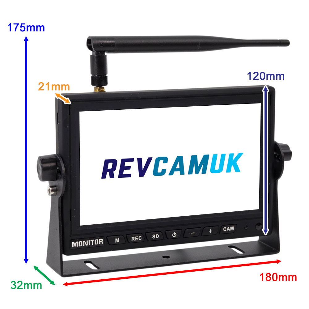 7" wireless reversing camera monitor dimensions – 180mm width, 120mm screen height, 175mm overall height, 32mm base depth, 21mm thickness with antenna