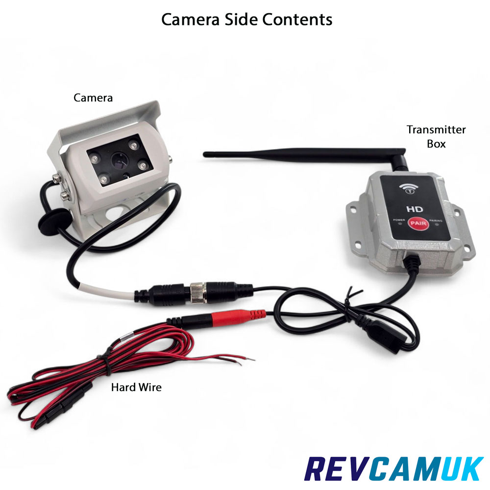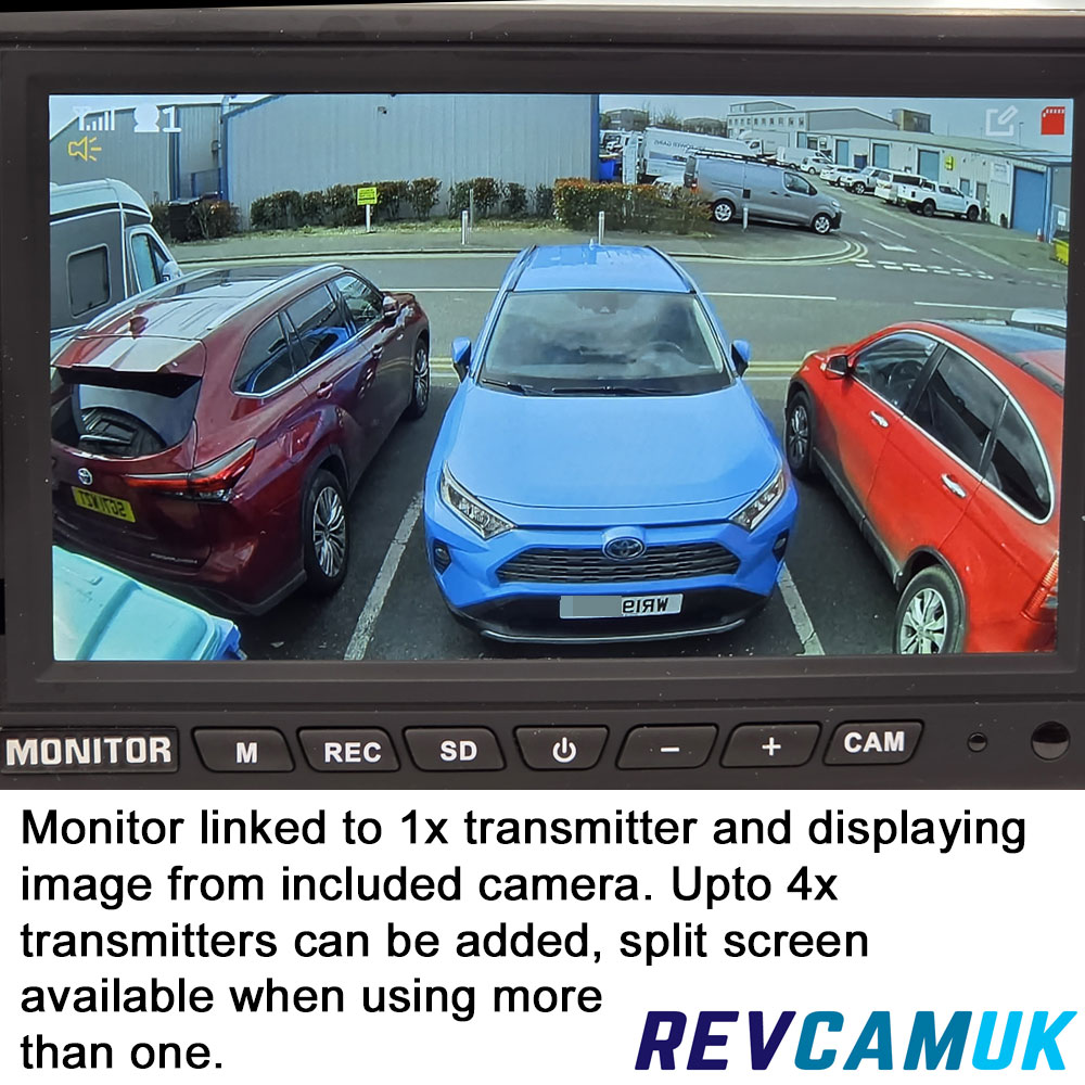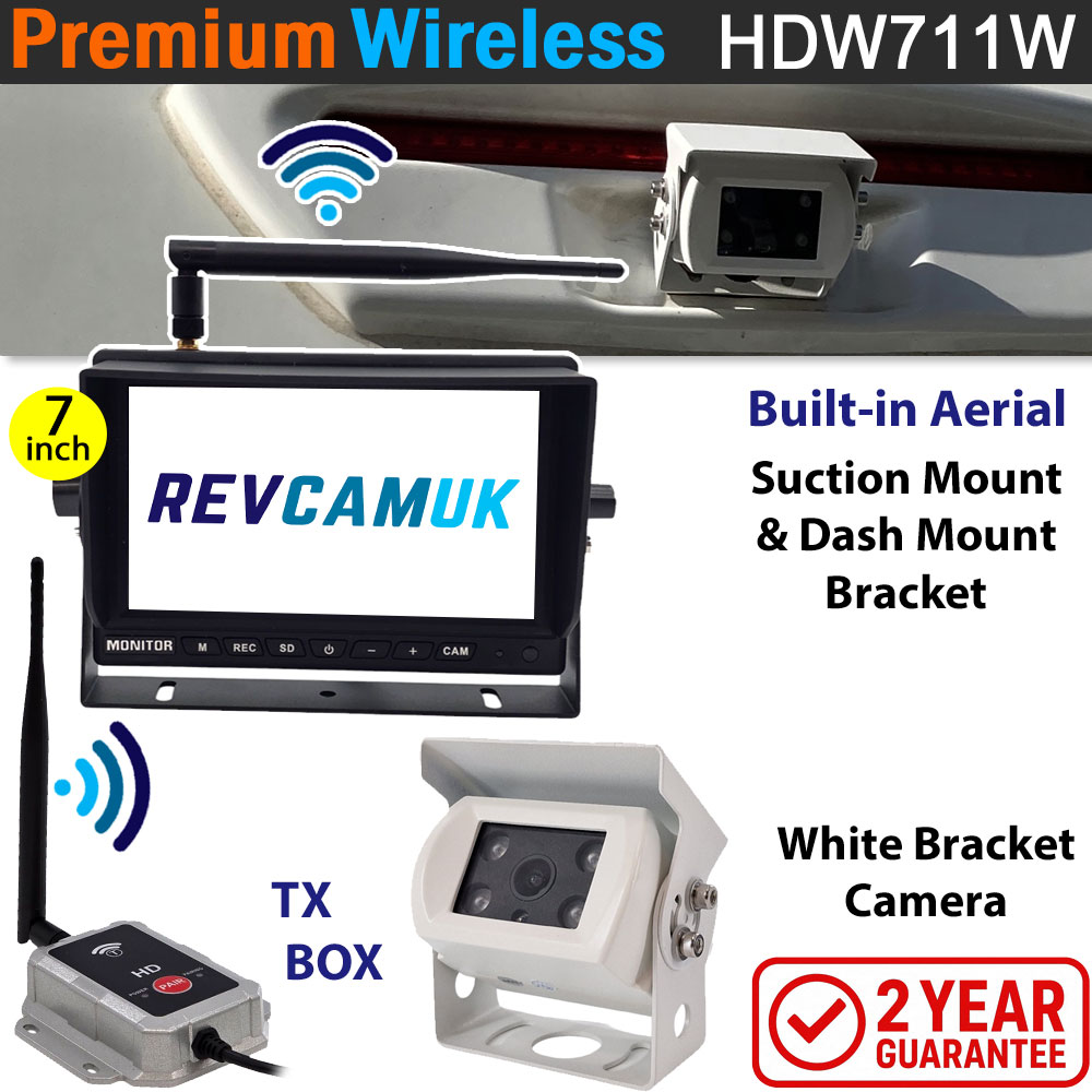 7" High Definition Wireless Reversing Camera Kit with Sony 1080P Bracket Camera - HDW711WThis wireless reversing camera kit combines our DW71 7-inch high-definition wireless monitor with transmitter and the CAM061AHD white Sony 1080P AHD bracket reversing camera. The system is particularly well suited to caravans, trailers and other towed vehicles where running a long video cable between the camera and monitor can be awkward or impractical. A wireless transmitter sends the HD video signal from the camera to the monitor while power is supplied locally at each end, greatly simplifying installation. 7" High Definition Wireless Monitor with Built-In Aerial / ReceiverThe wireless monitor features a built-in aerial and receiver designed to work with our AHD wireless transmitters. It can receive signals from up to four transmitters, allowing multiple cameras to be displayed on the screen if required. Various split-screen display modes are available, allowing you to monitor multiple cameras simultaneously. One camera and transmitter are provided with this system in this listing. Sony IMX307 Starlight 1080P Image SensorThis camera uses the Sony IMX307 Starlight image sensor, delivering detailed 1080P high-definition images with excellent colour balance and strong low-light performance. It produces a genuinely high-quality HD image when used with compatible AHD monitors such as the wireless monitor supplied in this kit. Transmitter & Monitor Designed to Work with the AHD 1080P Reversing CameraThe included transmitter wirelessly transmits the AHD video signal to the monitor, preserving the detailed image produced by the modern 1080P reversing camera in this kit. Heavy Duty Monitor Mounting BracketThe monitor is supplied with a strong metal U-bracket allowing it to be securely mounted on dashboards or other suitable surfaces within the vehicle. Alternative mounting brackets are available if required, and you can choose from these options when ordering. Power Options Included as StandardThe monitor is supplied with both a 12V lighter plug and a hard-wiring power lead as standard, allowing installers to choose the most suitable installation method depending on the towing vehicle. Important Note Regarding Recording ButtonsThe monitor includes SD and REC buttons on the front panel; this unit is not configured for recording. We do not advertise or supply this monitor as a recording device. In our experience, many built-in-recording monitors perform poorly and reduce overall reliability, so this model is supplied purely as a live display unit. Rust-Resistant Stainless Steel Mounting BracketThe camera uses a stainless steel U-bracket, finished with a durable matt white coating. This provides excellent corrosion resistance while maintaining a neat appearance over time. Unlike mild steel brackets, it will not produce rust streaks on the vehicle body. Infrared Night Vision LEDsBuilt-in infrared LEDs illuminate the area directly behind the vehicle in low-light conditions, allowing the camera to continue providing a usable image when reversing in darker environments. IP68 Waterproof HousingIP68 waterproof housing, proven to withstand the worst the British weather can throw at it. Choice of Viewing Angle for Parking or Rear View UseChoose a 60-degree lens angle for an always-on rear view to accurately replicate how far following vehicles are, or select a 120-degree lens if you prefer a little wider field of view to see what is around the adjacent lanes behind you, too. The image output is mirrored, so the left and right orientations appear as expected when reversing. 4-Pin Aviation ConnectorThe camera uses the standard 4-pin aviation connector commonly used in reversing camera systems. This provides a secure, weather-resistant connection compatible with our range of cables, adaptors and accessories. What’s in the box